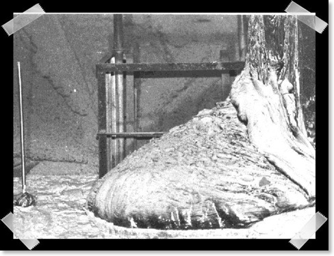 Una telecamera mobile su un robot fu avvicinata ad una massa gigantesca fusa con una forma a zampa di elefante che, all'inizio non si riusciva a capire cosa fosse.